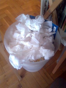 My watery dry eyes sting. My throat tickles from post nasal drip. My lips and nose are chapped raw from being rubbed the wrong way with an assortment of 2-ply paper products. Wads of tissue dot the landscape of my apartment. My waste basket runneth over with Kleenex. White specs of paper flakes cling to my dark t-shirt like dandruff. I breathe heavily in rasps of throat clearing coughs (ahem ahem). My ears ring. OK, well my ears usually ring anyway, but that’s another story.