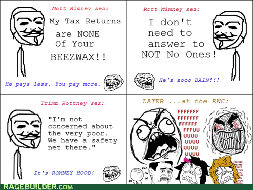 The bottom line: Mitt Romney and his pals have more money than God … but they want more of yours anyway. His whole campaign, the usual GOP trickle down voodoo economics stance on taxes, really boils down to this: ‘he pays less, you pay more’. This is not rocket science. Just Say No to ‘Mittens’.