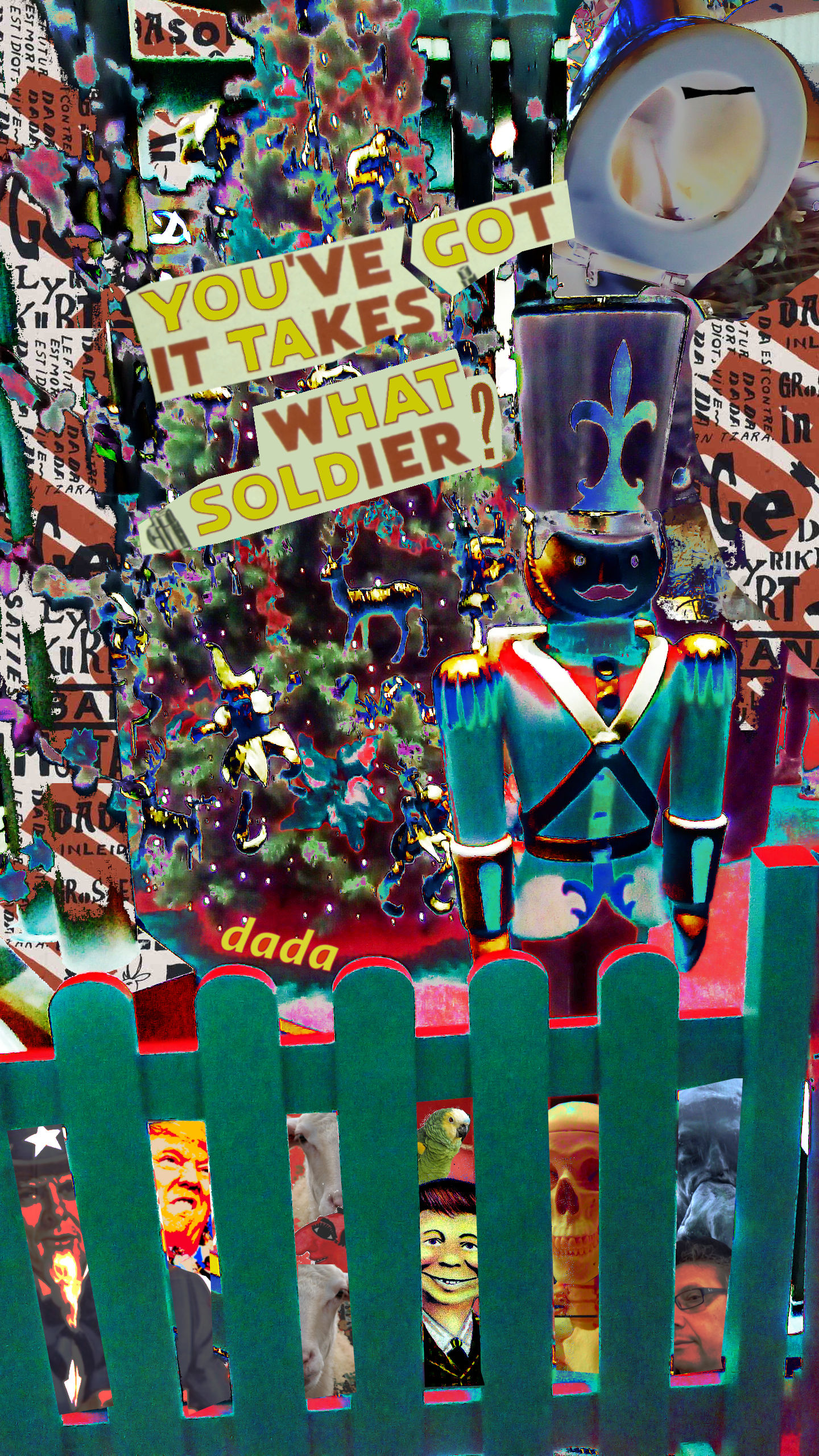 Yes! All was well in Dadaland … until the day a cargo freighter fell from the heavens above … flooding the village with its hold: an assorted mix of pink lawn flamingos, toy bowling pins and tin soldiers. The village was never the same … and in three days’ time descended into the annals of mediocrity as just another lost Atlantis cum Washington.